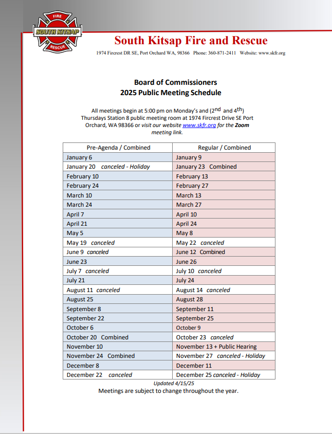 For the 2025 South Kitsap Fire and Rescue Commissioner Meeting Schedule click HERE.